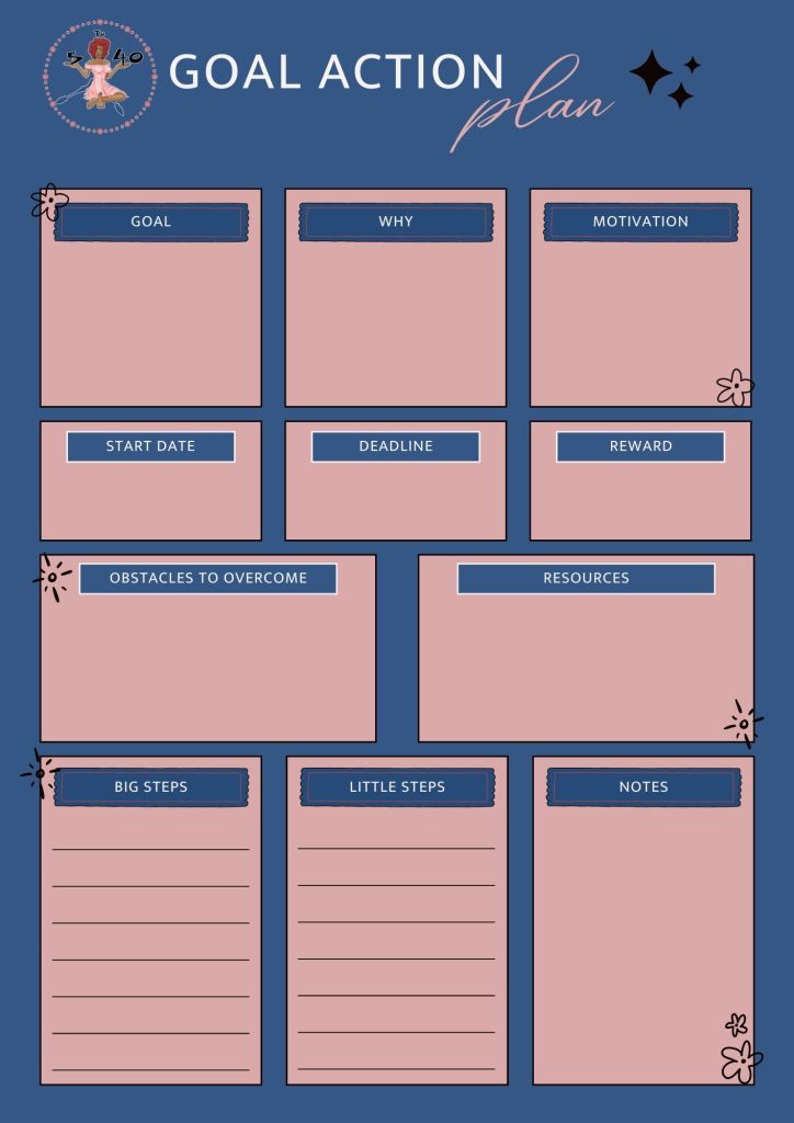 To help you break down your goals into steps, you can use tools like this Goal action plan I created just for you.